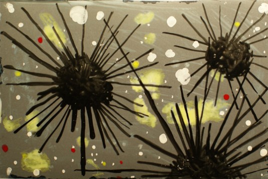 Leaves are raining down against a slate grey horizon this morning. If clear skies weren’t forecasted for this evening, I would wonder if snow was on the way. It seems our autumn weather will be very short lived this year. So I was drawn to this beautiful drawing entitled ‘Sea Urchins Exploring the Cosmos’ by a new friend Jeanne. The background color eerily matches the morning sky. I love the bold sea urchins, placed in the stars rather than the water. I am an engineer by training and profession, spending many years working on satellite systems. Like most engineers of my generation, I was transfixed by the days of early space exploration, and especially the Apollo missions to the moon. What really struck me about this drawing was how the sea urchins resemble the earliest satellites. Perhaps the engineers chose a globe shape to echo the planets, extending antennas in all directions once the satellite was deployed. Like the sea urchins, these satellites found their way using long spines, reaching out to learn about their surroundings. While Jeanne’s imagination may seem a stretch to some, this engineer finds comfort in the continuity between art and science. We cannot build what we cannot imagine. Take time today to open your mind to new ideas and seek out creative expression. Allow the Author of Creation to inspire and empower you, using nature as a blueprint to shoot for the stars. Let go of what is and embrace what can be. And remember all it takes to reach out, like the sea urchin, is one spine at a time. Art by Jeanne Mischo